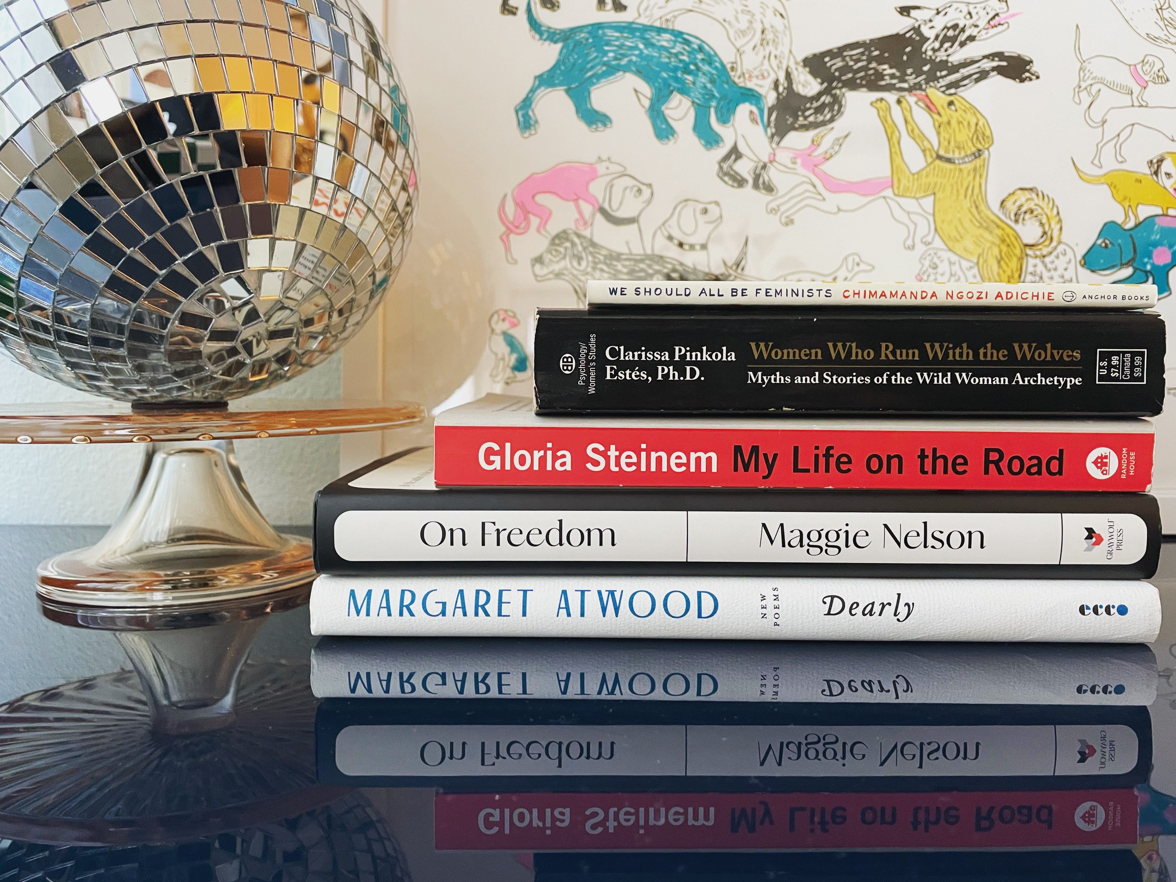 Less recent but just as lovely are three prints I purchased from UK printmaker Sam Marshall. I follow her on Instagram, and I can’t decide whether I enjoy her seeing linocuts and etchings or her adorable mini dachshund Miss Marple more! Curled Up, Those First Few Days, and Lots of Dogs (on our console as seen below) are the ones I added to my little collection. Bonus: may I suggest a mirror ball for no other reason than to make you smile (or perhaps to inspire an impromptu dance party in your living room)? Placed in a sunny spot, the light dancing on the walls will never fail to elicit happiness. Trust.
