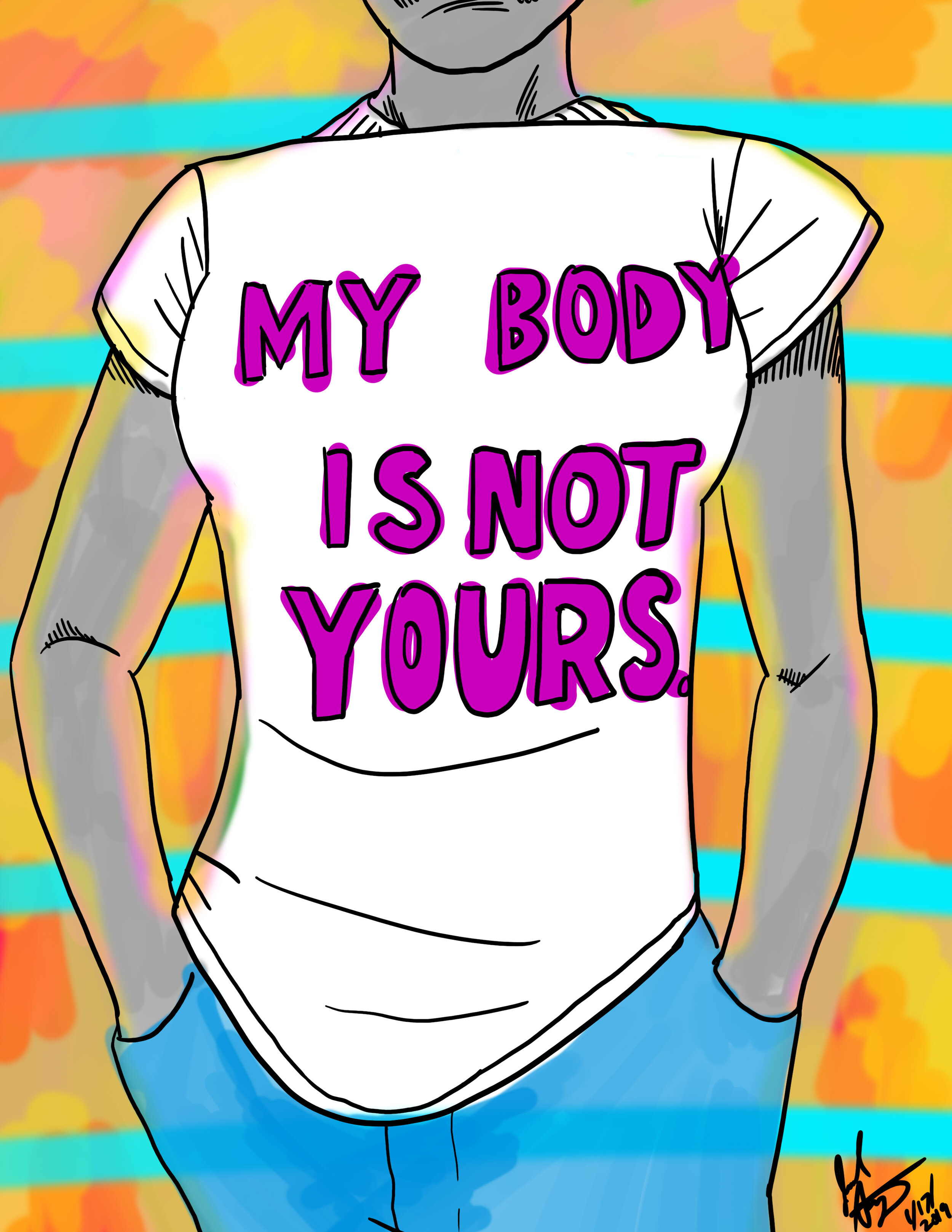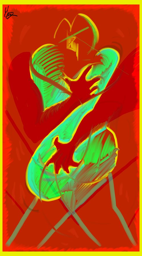 Schwartz does political cartoons and activist artwork as well as more abstract and figural art pieces. He seeks to make the world a better place through every medium he works with, whether it is mobilizing for a deeply-felt cause or bringing joy to a single viewer. I’m continually in awe of the way he sees the world, then brings those visions to a canvas. His piece Hold Me Close hangs in my living room, perfectly set off by an emerald green frame from Framebridge. I am also very partial to Pan & Syrinx and to the #MeToo anthem work My Body Is Not Yours, a perfect summation of the abortion, rape, trans rights, and marriage equality issues we have to endlessly address.