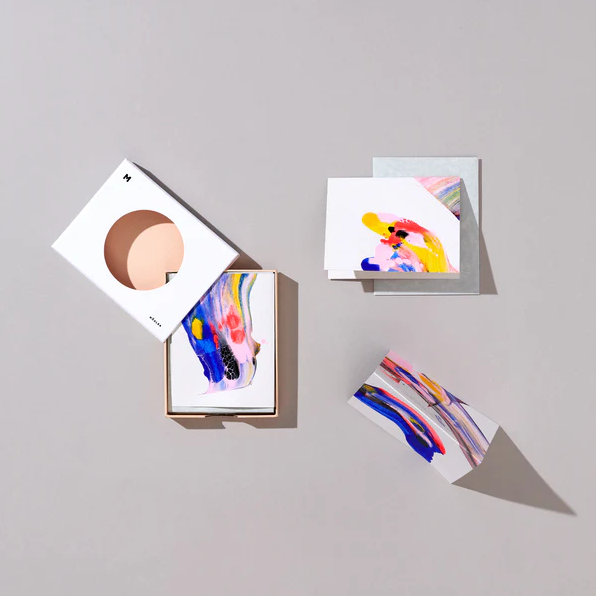 I was gifted a beautiful set of hand-painted notecards by my partner when we stumbled upon them in a sweet little local stationary shop, and when framed with wide white mats, they make for a beautiful set of small paintings for a gallery wall. Two live in our living room grouped with Paige Gemmel’s Dogs on Orange (also a recently addition), and the remaining four are hung vertically in our kitchen. I love how from certain vantage points in both rooms you can see all six — they pull the spaces together so well!