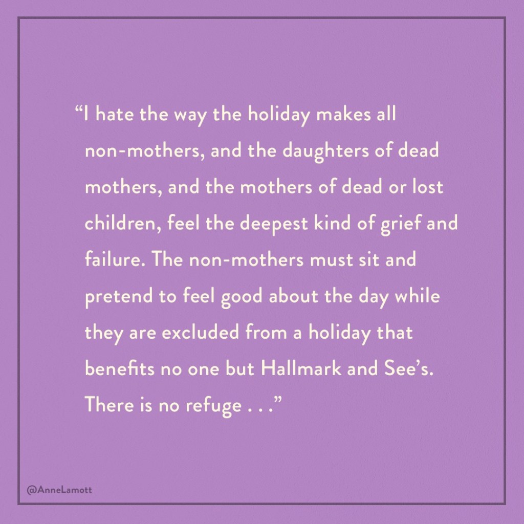 This weekend is Mother’s Day. It is a time to celebrate motherhood, yes. But it is also a very complicated holiday. “Mother’s Day celebrates a huge lie about the value of women: that mothers are superior beings, that they have done more with their lives and chosen a more difficult path.“ The lovely Ann Lamott expresses this complexity with beautiful candor, and her words got me thinking: I love my mom dearly. She is still alive to celebrate with, and I am lucky to have had a happy childhood. Also I have chosen to remain childfree. I feel like Mother’s Day is a holiday that is about my mother and not me, but maybe there is room for the aunt-ing and pet parenting and mother-hen-ing of friends I do, too? Regardless of how I eventually answer that question, I have enormous compassion for the day’s complications, and the women who bear them gracefully, silently, and with a certain amount of internal rage or sadness. I see you if you’ve lost your mother. If you are estranged from your mother or your children. If you have a difficult parent/child relationship. If you’ve lost a child. If you’ve yearned for children and cannot have them. If you have children and yearn some days for something different. There is nothing wrong with perhaps wishing for a solo glass of champagne instead of shepherding a crowd of kids and moms-in-law et. al. to IHOP when you don’t even like pancakes. I see you all, and I’m sending you love.